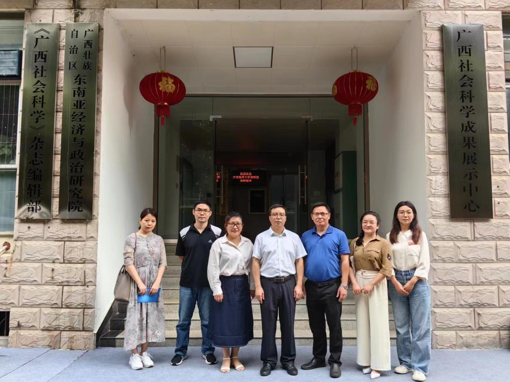 7月6日下午,陈伟一行应邀先行参观了广西社会科学成果展示中心、《广西社会科学》杂志社和《改革与战略》杂志社。东南亚研究院院长李冬青给学院一行介绍并展示了广西社会科学重点学术成果和富有民族特色的非物质文化遗产。《广西社会科学》杂志社社长梁培林和《改革与战略》杂志社社长王政武分别介绍了杂志获奖、稿件收录和编审方面的情况。
