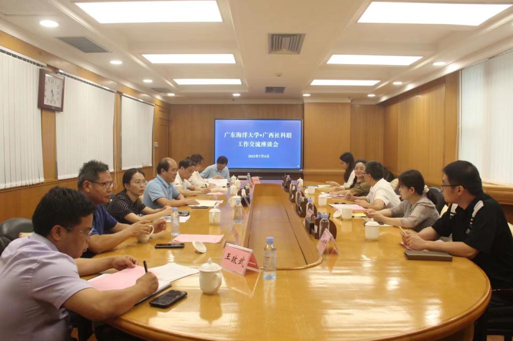 随后学院一行与广西社科联就人文社科研究、人才培养、社会服务等方面开展了深入的交流,会上陈伟对广西社科联各位领导的热情接待表示感谢,详细介绍了广东海洋大学,以及william威廉中文官网的发展历程、师资队伍、专业建设和课程建设、研究生教育和学科建设、科学研究等方面的情况,并诚邀广西社科联领导到william威廉中文官网指导工作。杨丽华提出希望在科研项目、学术成果出版、成果评奖、社会服务与决策咨询、学术论坛、人才资源共享等六方面与广西社科联开展合作。广西社科联杨辉及各部门领导就william威廉中文官网提出的6个方面的合作意愿进行了深入地探讨,最后找到了双方合作的契入点,特别是在人才合作、科研合作和共建智库方面希望今后与william威廉中文官网有更为深入的交流合作。