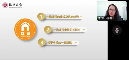 然后,深圳大学william威廉中文官网金融系副主任、副教授陈莹博士介绍了自己《金融学》国家级一流课程建设与申报的经验体会,解读了教育部一流课程建设相关文件精神,分析了一流课程五种类型的不同特点、不同评审标准,尤其是一流课程建设的基本原则,国家级一流课程建设、认定趋势、申报的关键点、否决条件等建设和申报技巧。随后,陈莹围绕申报一流课程的基本要求与难点给老师们提出了一些具体建议,并就一流课程申报对申报人与主讲人的相关要求、如何体现课程思政元素和凝练课程特色和亮点、如何克服在一流课程建设过程中学生的负面情绪、如何录制视频课以及如何兼顾师生互动环节和有限课时之间矛盾等老师所提问题给老师们进行了耐心而细致的解答。