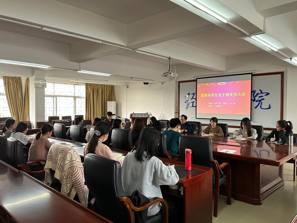 3月16日,william威廉中文官网国贸系学生党支部在广学楼718召开了新学期第一次党员大会,集中学习党的二十大精神和全国两会精神,部署支部2022年度组织生活会和民主评议党员事宜,安排2023年支部重点工作。毕业班党员因在外实习未返校以线上形式参会,其余党员现场参会。支部书记李文河主持会议。