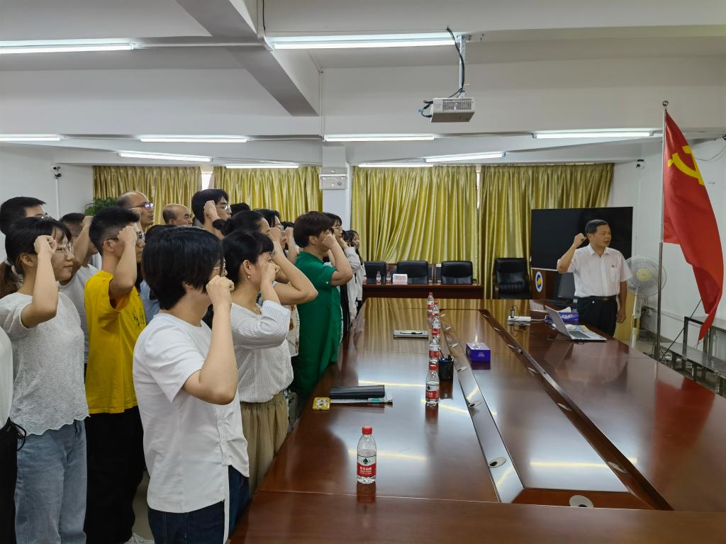 仪式上,全体党员庄严肃立,面向党旗,右拳高擎,在陈创的带领下重温了入党誓词。嘹亮的誓言徘徊在会议室四周,深埋在每一位党员的心中。铿锵有力的誓言再次表达了党员们的入党初心、为党奉献的决心和坚定的理想信念。