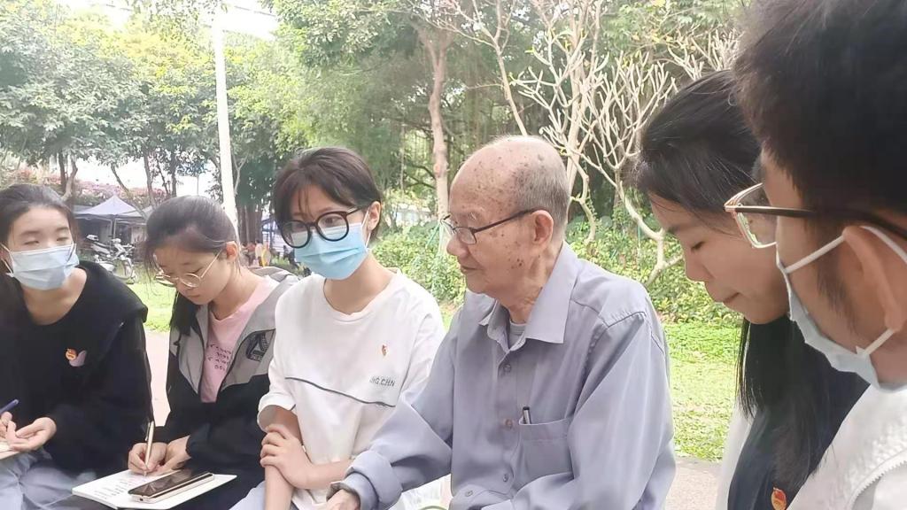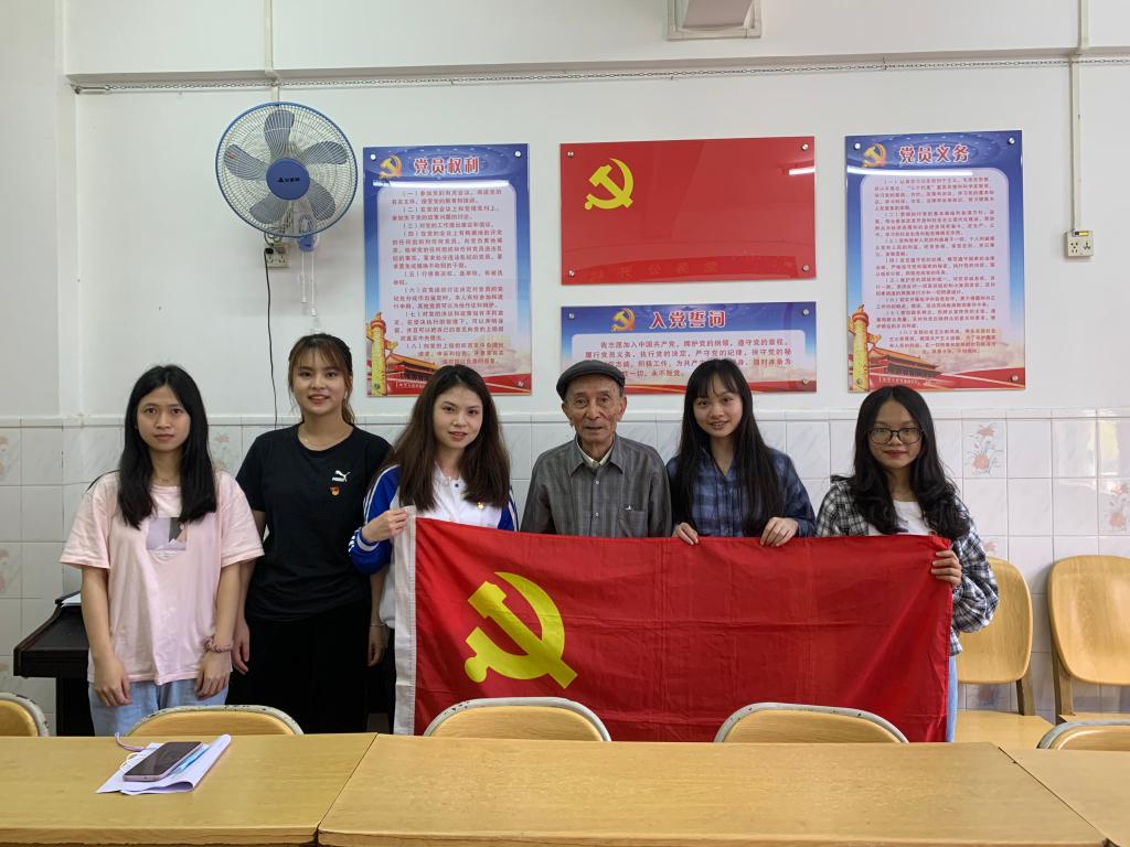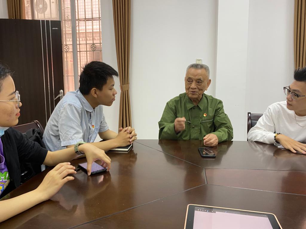 20日,学生代表分为三个小组,走街串巷、进村入户寻访老党员、老战士、老模范。在海滨公园,同学们采访了93岁高龄的罗国华老同志,罗老先生是跟随着党从抗日战争和解放战争胜利走过来的老战士,1941年便加入了中国共产党,从此将自己的一生都奉献了给党,退休后坚持给广大青年学子讲述党史和革命史。在此次采访中,罗老先生给同学们上了一堂生动详实的党课、历史课,勉励同学们要继承和发扬党领导革命的优良传统与作风,好好学习文化知识,认真深入学习党史,争取早日成为国家的栋梁,即使不能成为国家的栋梁,也要尽力为国家做贡献。在赤坎军休所活动中心,同学们如约见到了田欣民老党员。田老先生原是空军二师副参谋长,飞行时长达29年,1991年退伍,曾被中组部评为全国离退休干部先进个人。在访谈中,田老先生回顾了自己作为一名光荣的人民空军的飞行生涯,教育引导同学们时刻要以一颗赤子之心、忠于祖国、忠于党,践行党为人民服务的初心和使命,有一份心出一份力,遇事要沉着冷静,善于依据平时的经验和学到的知识积极应对。在黎耀老党员的家里,同学们受到了他热情的接待。黎老先生家乡是革命老区,从小就受中国共产党领导革命的影响,青少年时期便跟随当地的地下党组织参加革命,刚满18周年就入党了,至今已有50年党龄。在访谈中,黎老先生讲述了其从小就参加革命的故事、入党前后的思想变化,以及工作期间和退休后的难忘经历,希望同学们要始终坚定信念,爱国爱党,学好本领,为社会、为人民贡献一份力量。