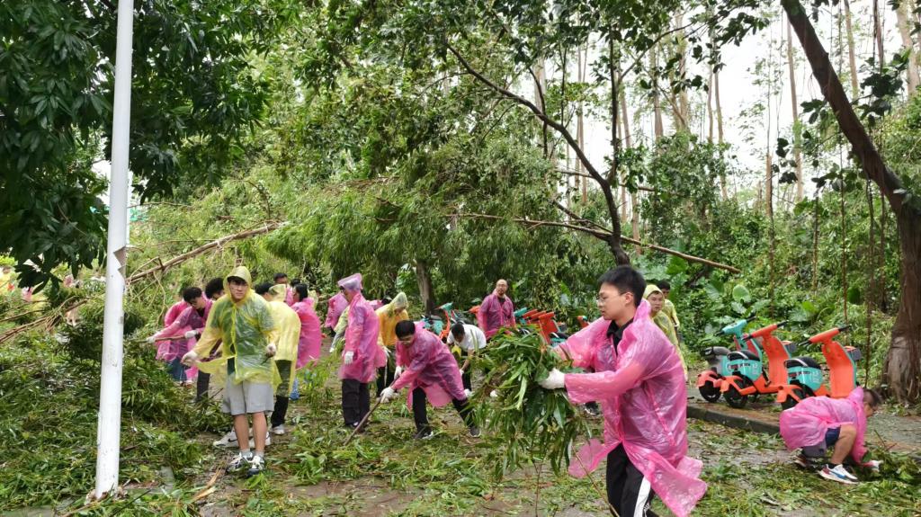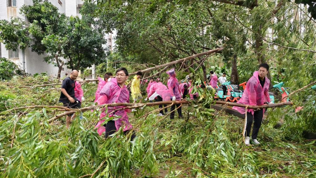 在作业过程中,党员干部、入党积极分子和志愿者们主动承担险活、脏活、累活、重活,发挥不怕苦、不怕累、不怕险的工作精神,使用各种工具和双手出大力、流大汗将无数断落的树木杂枝搬走、将满地的落叶清扫干净、将堵塞排水管道的淤积物疏通。大家分工合作、齐心协力、忘我地劳动,逐一将树枝碎叶淤泥清理干净,全力以“复”,让台风过后的校园迅速“焕新”,争分夺秒按下灾后“复原键”。