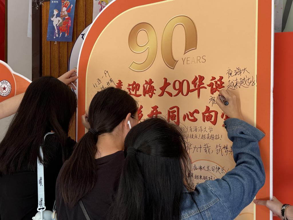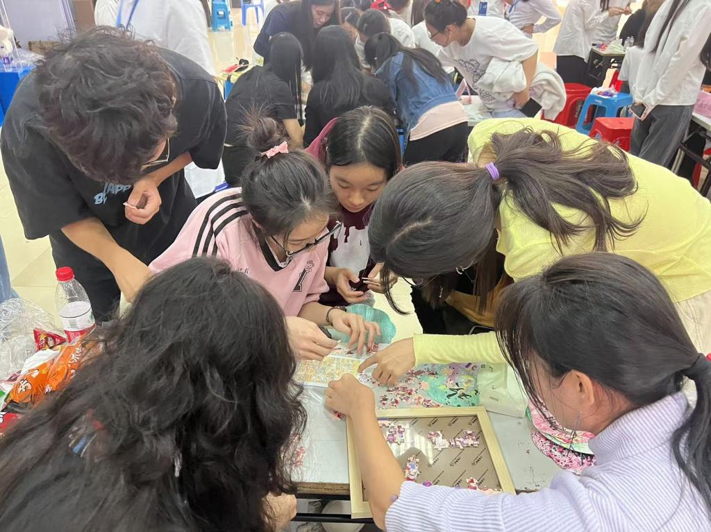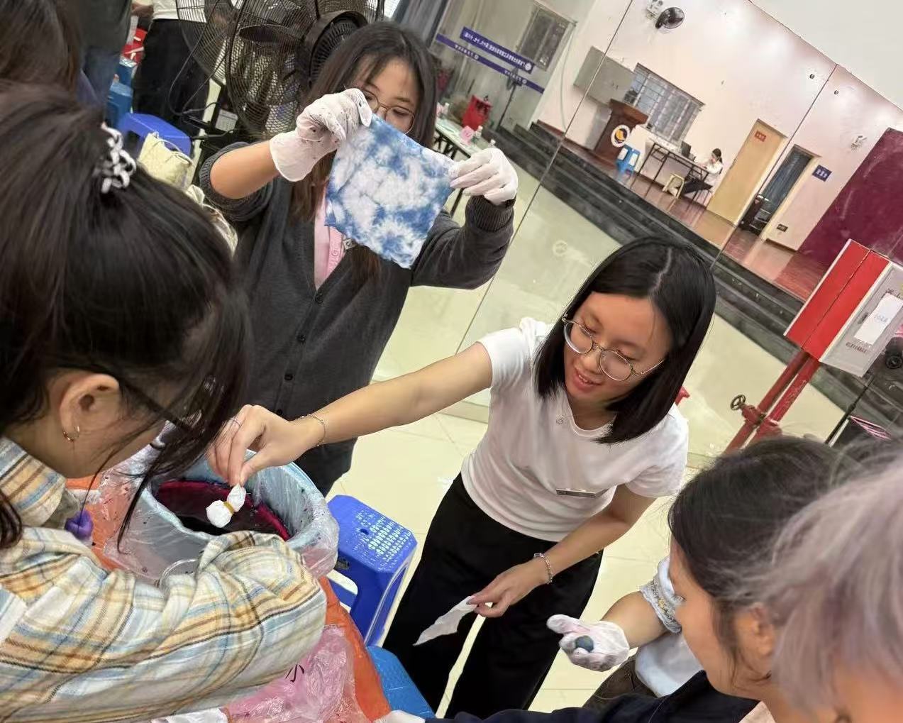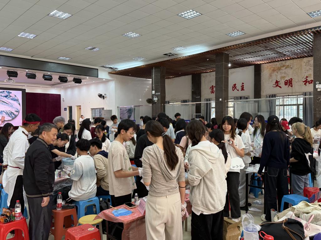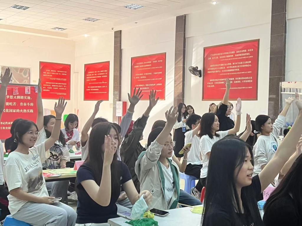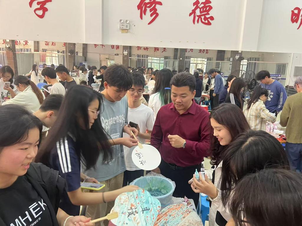 活动共分为三个环节,分别是爱党爱国爱校主题教育、优良学风助力学生成长主题教育和传承中华优秀传统文化体验活动。一是筑牢信仰根基,厚植爱国爱校情怀。在本环节,叶梦怡老师通过理论知识宣讲方式深入浅出地讲解了党的民族理论与政策,结合实际案例,让师生们深刻理解了民族团结的重要性和时代内涵。同学们还通过合唱国歌、校歌,校党史知识、校庆知识和民族文化知识竞答,“我为海大90华诞送祝福”“心心相印”等活动中深化了对党的方针政策的认识,进一步巩固树立了正确的国家观和民族观。二是打造学习交流平台,助力形成优良学风。活动邀请国家励志奖学金、学业奖学金获得者迪丽胡玛尔同学进行学习经验分享,她从自己的学习成长经历出发,为同学们提供了宝贵的借鉴。三是传承中华优秀传统文化,共筑民族精神家园。活动中,各民族师生踊跃参与扎染、漆扇等非遗手工体验项目,在实践操作中亲身体验传统文化的魅力。活动现场热闹非凡,欢声笑语此起彼伏,宛如一片欢乐的海洋。