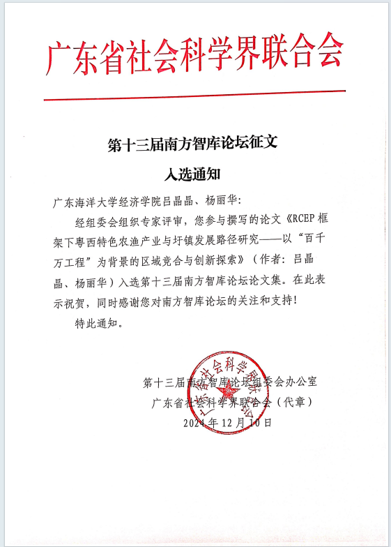 作为2024年广东海洋大学海洋经济与管理研究中心提升项目、2024年广东海洋大学“双百行动”项目《RCEP框架下湛江特色农渔产业高质量发展模式》的阶段性成果,该论文基于区域竞合理论,提出了一套系统全面的协同发展路径,着重从产业协同、区域协同以及社会协同三个维度发力,致力于推动粤西特色农渔产业与圩镇达成高效协调发展的目标。