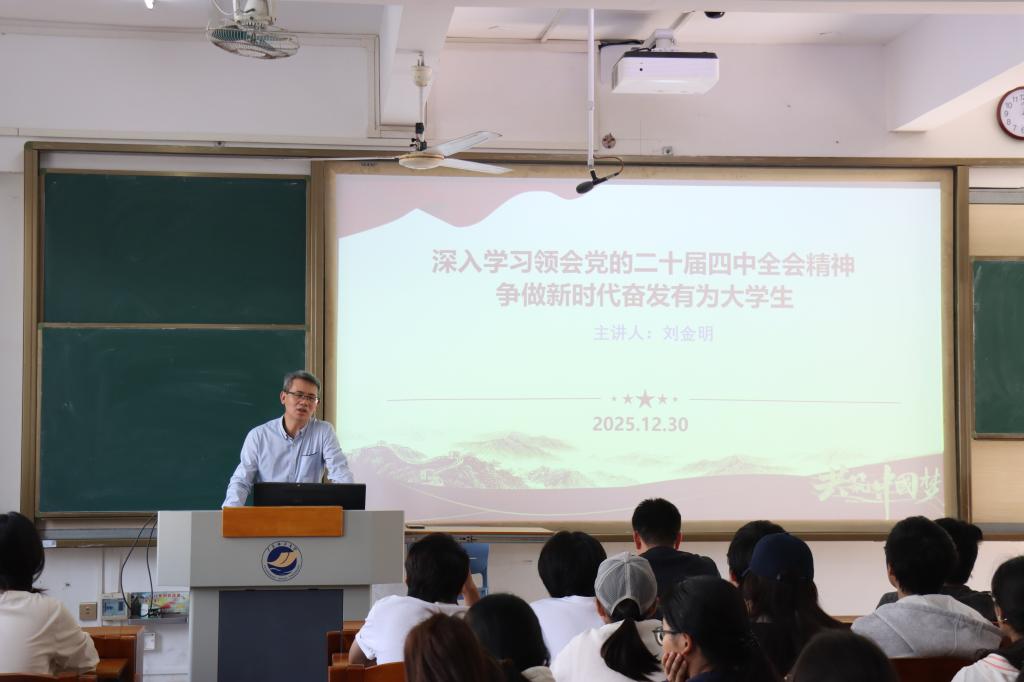 12月30日下午,经济学院党委书记刘金明以《深入学习领会党的二十届四中全会精神,争做新时代奋发有为大学生》为题,在湖光校区明德楼B1201教室为120多位学生干部和学生党员讲授思政课。