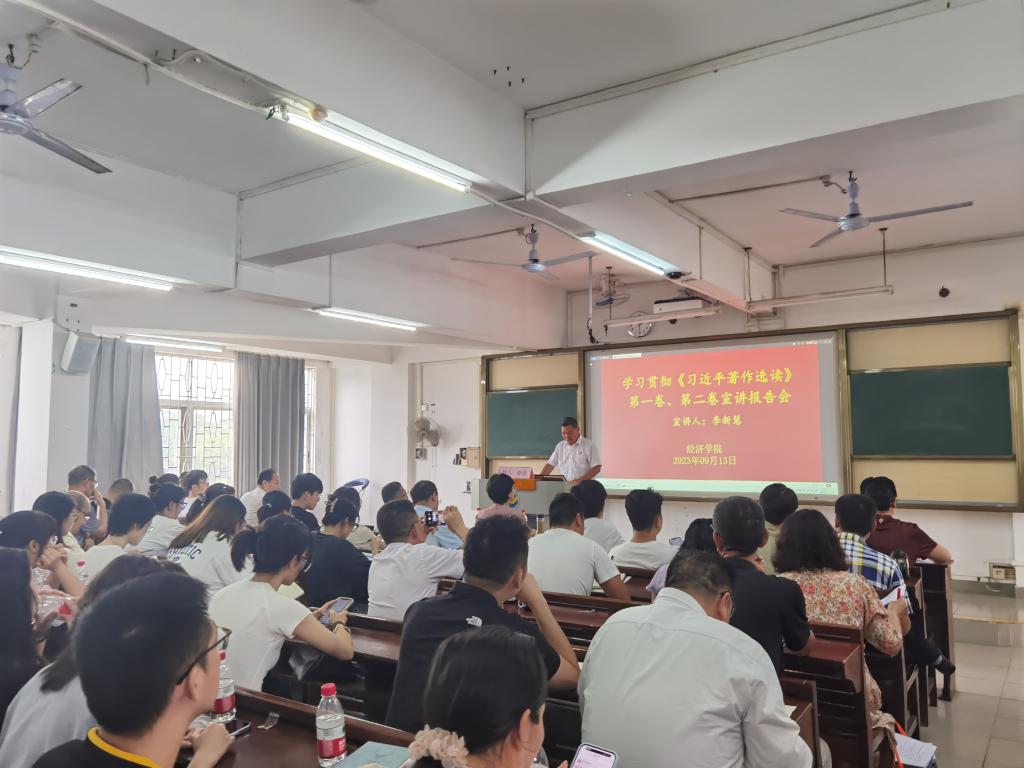 9月13日下午,william威廉中文官网在广学楼709召开学习贯彻《习近平著作选读》第一卷、第二卷宣讲报告会。学校理论宣讲团成员、马克思主义学院副教授李新慧受邀做了题为《坚定拥护“两个确立” 坚决做到“两个维护”——认真学习<习近平著作选读>第一卷、第二卷》的专题辅导报告。学院领导、教职员工、本科生、研究生党员共128人参加了会议。报告会由学院党委书记陈创主持。