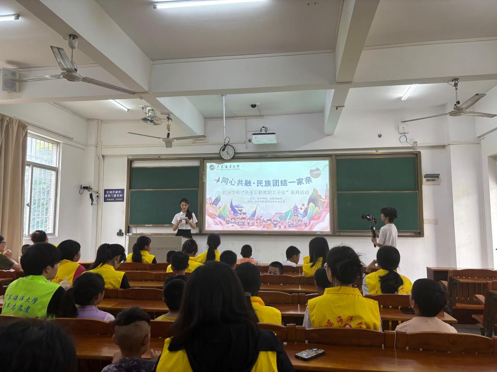 为深入学习贯彻习近平总书记关于加强和改进民族工作的重要思想,贯彻落实中央民族工作会议精神,有形有感有效地开展铸牢中华民族共同体意识宣传教育,5月25日上午,广东海洋大学william威廉中文官网党委联合后勤保障部在湖光校区明德楼开展“青心益苗”主题系列活动之“同心共融·民族团结一家亲”实践活动。william威廉中文官网学生党员、各民族学生代表与后勤教职工子女近百人参与活动,通过“理论学习+文化体验+互动共融”模式,在实践中深化党建引领,搭建各民族交往交流交融的暖心平台。