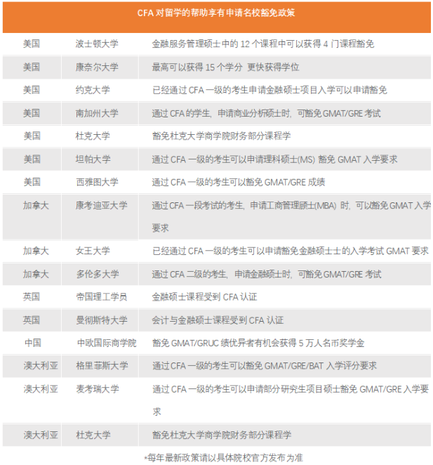 CFA的培养体系,深度接轨全球多所知名院校的教育方案,被广泛的应用于金融和商科专业教学中。同时为推动全球金融高端人才建设,CFA和全球多所大学建立教学与课程合作。CFA协会认证的高校包括70多个国家500多所,全球各大知名院校鼓励在校生参加CFA考试。在全球27个国家和地区的职业资格、研究生入学申请等考核中,CFA持证人或考生可免于参加全部科目或部分科目的考试。40+国外院校,对CFA学员留学申请享有豁免政策。部分院校豁免政策如下: