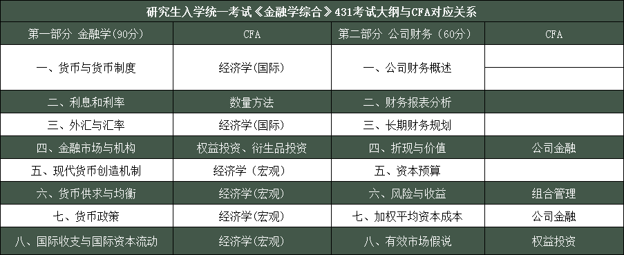 CFA全课程体系相当于金融学硕士学位,部分课程和商科知识高度契合。《金融学综合》是金融硕士(MF)专业学位研究生入学统一考试的科目之一。《金融学综合》考试要力求反映金融硕士专业学位的特点。其中包括金融学与公司财务两部分,共计150分。