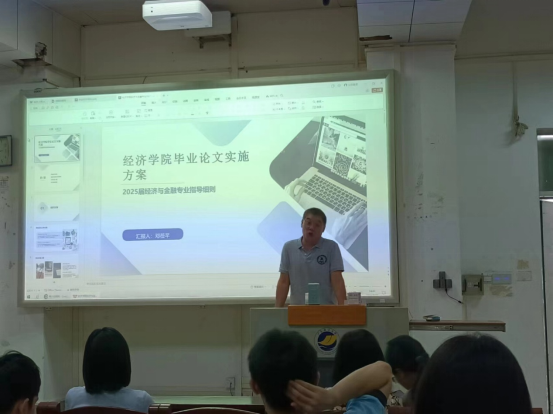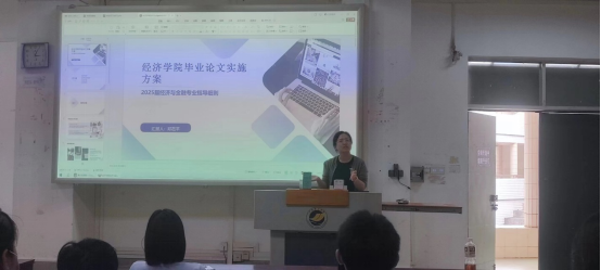 大会由金融系邓莅芊老师主持。会上,邓莅芊老师首先宣讲了经济与金融专业2025届毕业论文及毕业实习工作实施方案,详细介绍了论文撰写和实习的相关要求、时间节点及注意事项。