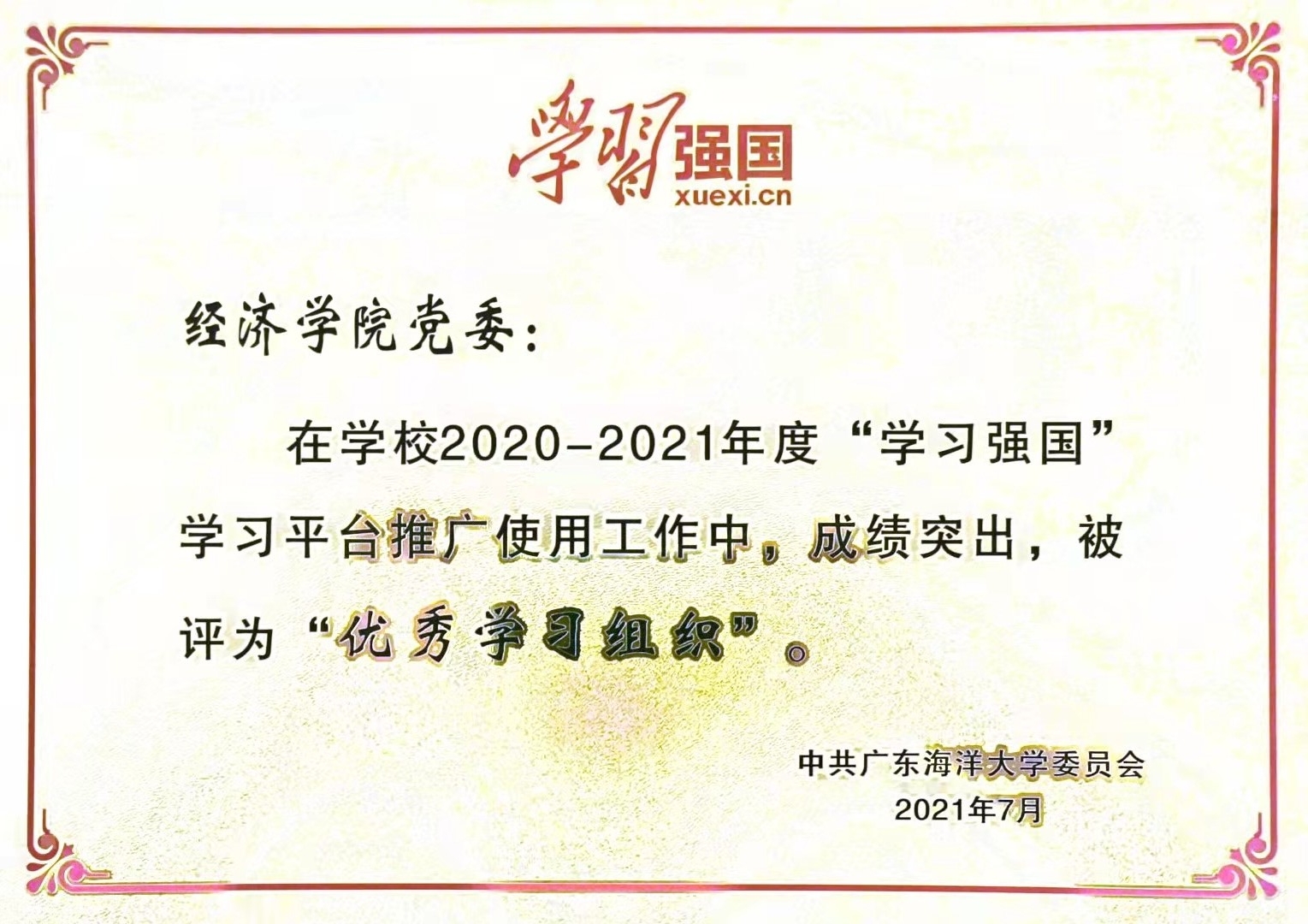 学院党委获2020-2021年度“学习强国”学习平台优秀学习组织称号