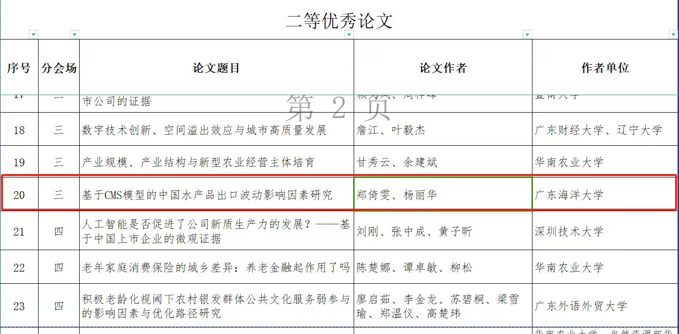 2024 年11月29日,广东省社会科学界联合会于广东人文社科网正式公布2024年广东社会科学学术年会优秀论文名单。其中,william威廉中文官网研究生郑倚雯与导师杨丽华教授合作完成的学术论文《基于 CMS 模型的中国水产品出口波动影响因素研究》荣获优秀论文二等奖。该论文以大食物观视角切入,针对中国水产品出口波动的影响因素展开深入的实证分析。研究成果表明,出口竞争力效应是造成中国水产品出口波动的关键因素,基于此研究结论,论文提出了具有针对性的对策建议。