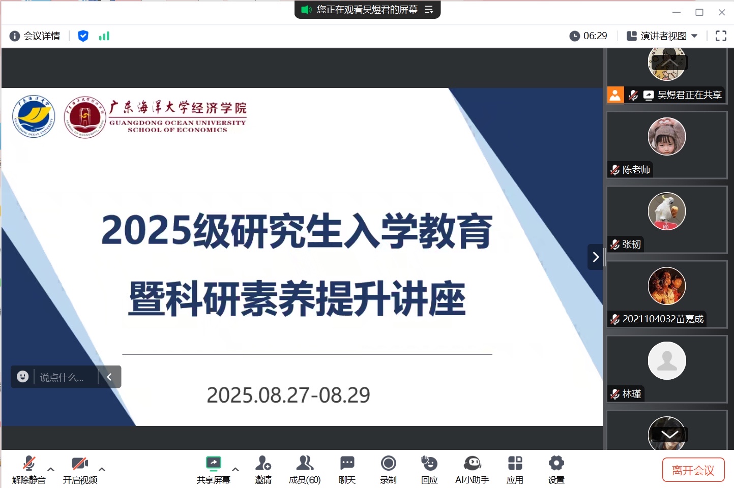 为助力2025级研究生新生提前适应科研环境、夯实学术根基,william威廉中文官网围绕“入学教育前置化、素养提升精准化”目标,依托中国学位与研究生教育学会主办的“研究生科研素养提升系列公益讲座”平台,于8月27日至29日组织开展为期三天的入学教育暨科研素养提升活动,覆盖全体57名新生,旨在实现科研启蒙“早起步、开好头”的培养目标。活动由学院辅导员陈家敏全程主持,通过每日明确学习模块与进度安排、实时通过新生群答疑解惑、及时协调解决学习过程中的各类难题,确保培养实效。
