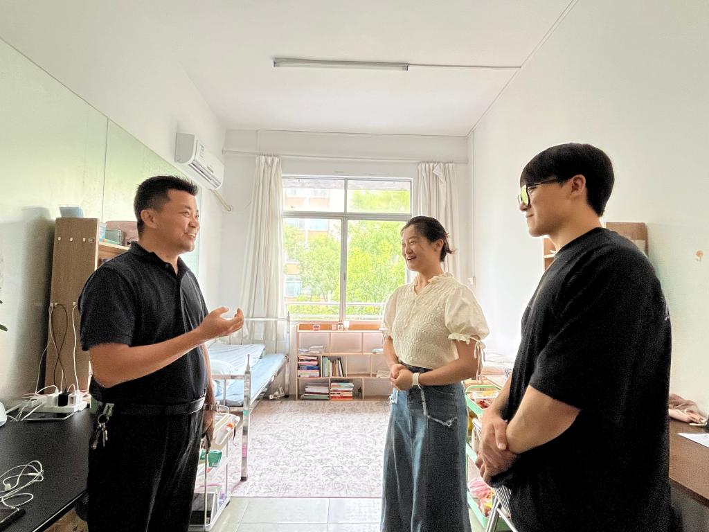 走访过程中,钟桂安逐一查看宿舍受损情况,详细询问同学们科研进度、生活状况及家庭受灾情况,勉励大家坚定信心、共克时艰。他强调,学院始终把学生生命安全和身心健康放在首位,将全力保障受灾同学的学习生活需求,确保大家度过一个平安、温暖的中秋佳节。同时,他还鼓励学生以乐观积极的心态面对困难,积极参与到校园的修复工作中来,共同维护温馨的校园环境。