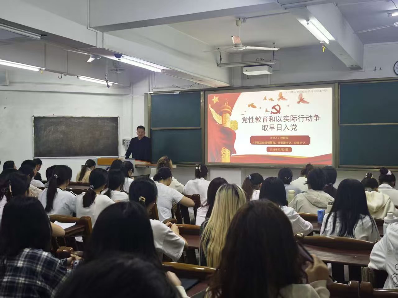 钟桂安发表动员讲话,勉励全体入党积极分子要珍惜此次培训机会,以高标准严格要求自己,在学习与实践中锤炼党性、提升素养。同时,他以《党性教育和以实际行动争取早日入党》为题开展第一讲,从“深刻理解党性的内涵” 与 “以实际行动争取入党”两大维度进行深入讲解。在党性内涵部分,他强调要树立坚定的共产主义信仰、站稳人民立场、具备强烈的组织纪律观念;在实践要求层面,他提出入党积极分子需在思想上积极上进、学习上勤奋刻苦、工作上勇于担当、生活上严于律己,为争取早日入党打下坚实基础。